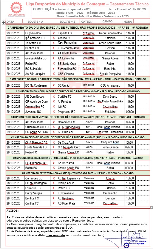 CONFIRA OS JOGOS DA ESPECIAL, MÓDULO II, VETERANOS E CATEGORIA DE BASE DOS DIAS 28 E 29 DE OUTUBRO