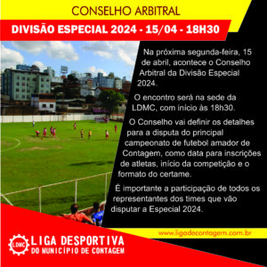 Na próxima segunda-feira, 15 de abril, acontece o Conselho Arbitral da Divisão Especial 2024. O encontro será na sede da LDMC, com início às 18h30.
