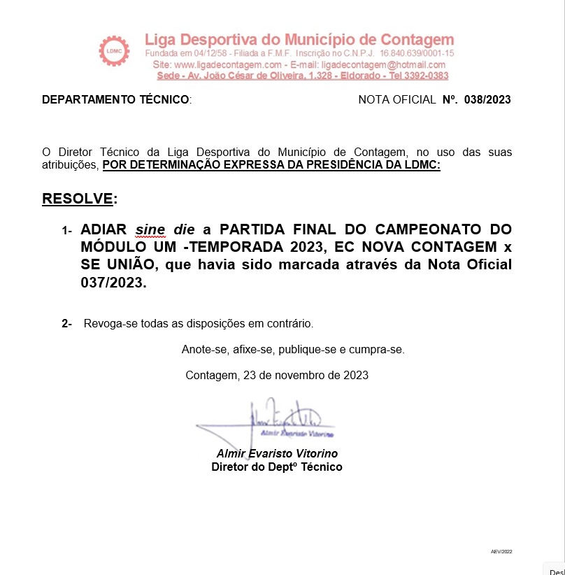 A final do Módulo Dois da LDMC 2023, marcado para o dia 26 de novembro, na arena CSU Amazonas, entre Nova Contagem e União, foi mais uma vez adiado.